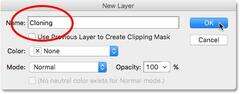 Click OK to accept the name and close out of the New Layer dialog box. Here, we see my new "Cloning" layer in the Layers panel: