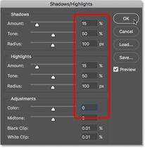 This expands the dialog box to show more advanced options. In the Shadows section at the top, set the Amount to 15%, leave Tone set to 50% and increase the Radius to 100px. Use the same settings for the Highlights section below it. Then in the Adjustments section, lower the Color value to 0 to prevent Shadows/Highlights from increasing the color saturation even further. Click OK to close the dialog box: